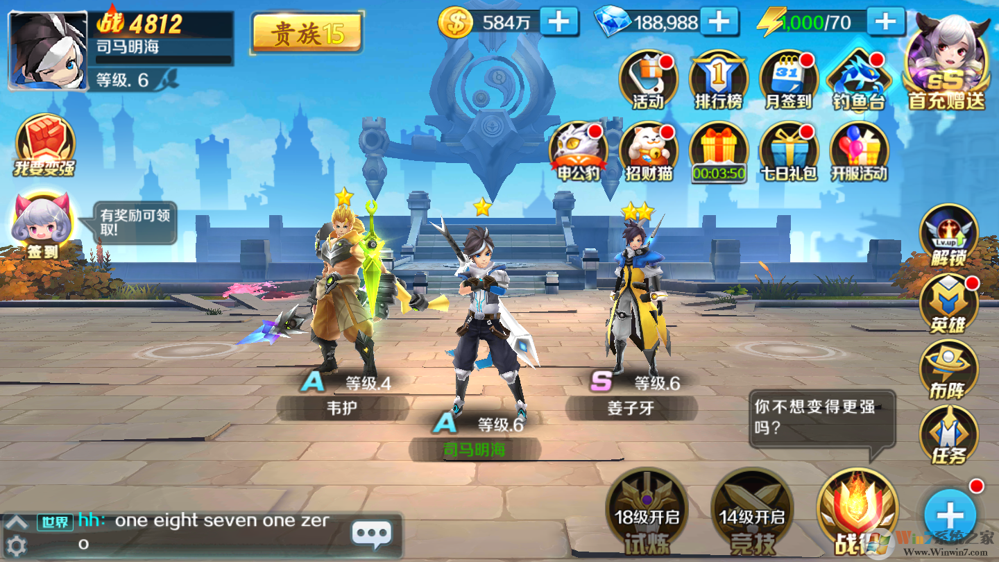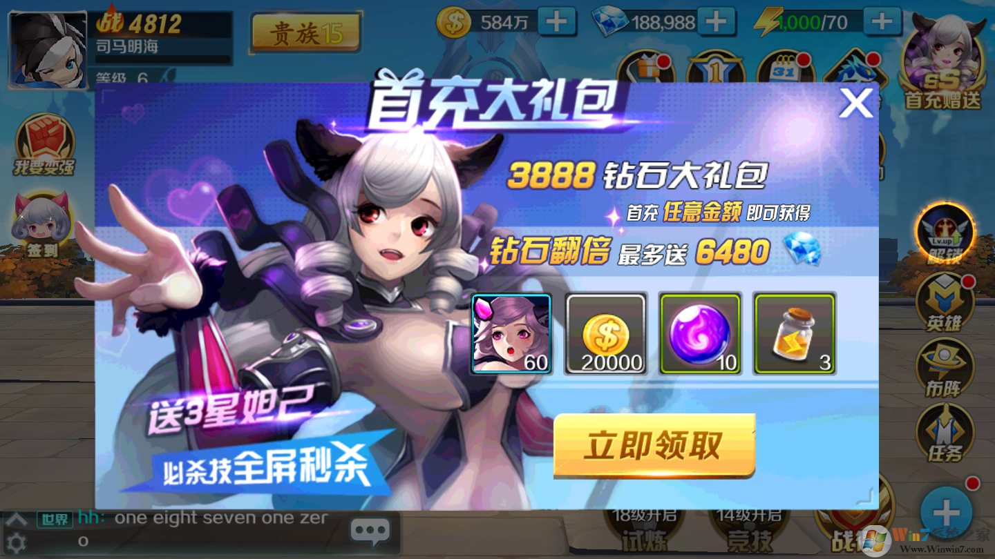 ★上线送满V,SSS神将,钻石*188888,金币*100W。