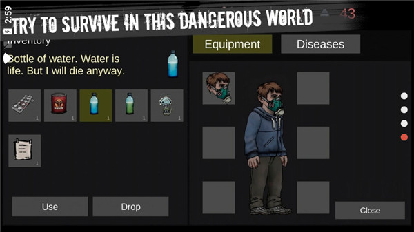 2、点击"New Game"进入游戏,打开背包,你可以看到自己的装备,疾病等等。