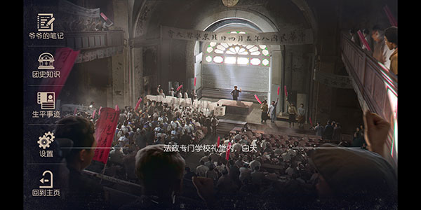 游戏流程:游戏的整体流程是通过对话和互动的形式进行推进的。玩家可以通过点击右下角的快进和自动按钮来加速游戏进程。左上角的菜单提供了爷爷的笔记、团史知识、生平事迹、设置和回到主页等选项,其中爷爷的笔记记载了许多历史事件,团史知识和生平事迹则让玩家更好地了解游戏背景和角色故事。