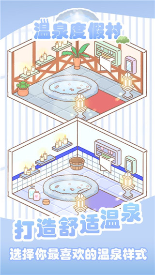 《温泉度假村》是一款融合休闲与模拟经营元素的趣味养成游戏,这款游戏以其精美的卡通画风、细腻的画面表现及悠扬的背景音乐,营造出一个梦幻般的温泉世界。玩家将扮演度假村的经营者,从零开始打造属于自己的温泉帝国,体验从规划布局到顾客服务的全方位经营乐趣。感兴趣的玩家们赶紧来下载试试看吧!