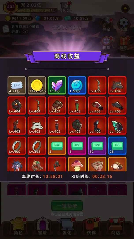 《挂机不能停》是一款轻松上手、乐趣无穷的休闲放置类RPG游戏。通过简单操作即可享受游戏乐趣,无需长时间在线,适合忙碌的你随时随地享受游戏的快乐。并且在这款游戏中玩家还可以召唤小伙伴协助你进行战斗,与伙伴组成队伍一起冒险,可以对敌人造成大量的伤害。感兴趣的玩家们赶紧来下载试试看吧!