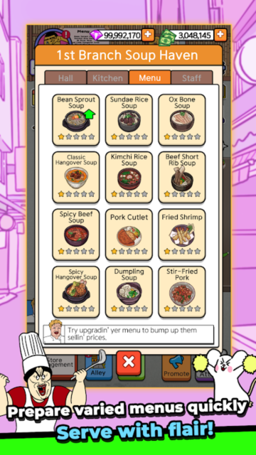 5、卡通风格的图画和活泼的人物设计,让您享受餐厅经营的乐趣。