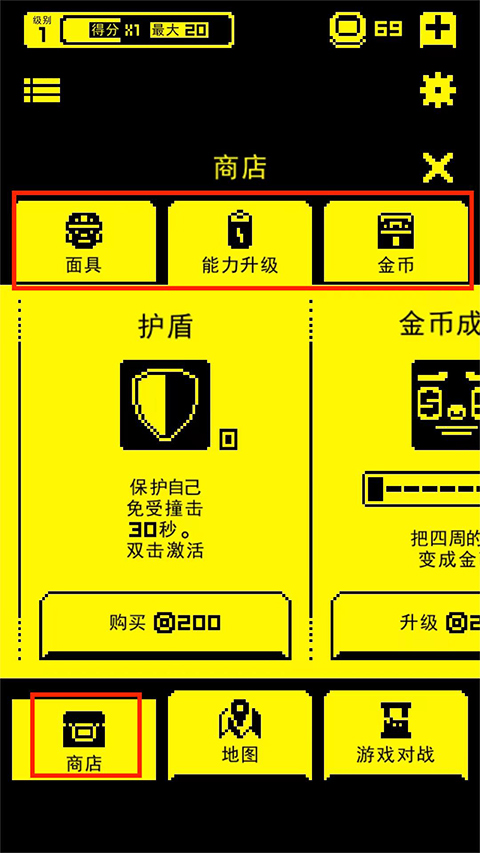 7、进入商店界面,包括面具、能力升级以及金币的购买,