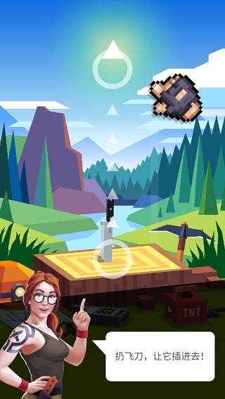 在插着刀具树桩的不远处是一颗装有上下移动靶子的大树,而我们要做的就是以合理的力度、角度拔出刀具,让它精准地命中靶子。当然,并不一定要求完美命中靶心、稍有偏移也是可以接受的事,只要不完全脱离靶子就是可以接受的。