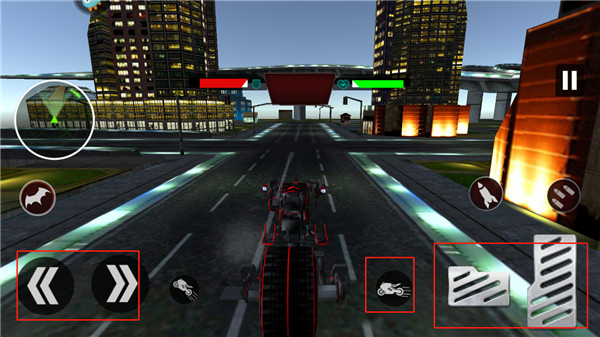 4、点击摩托车形态,玩家即可操控摩托车,左边控制方向,右边控制刹车,油门以及武器;