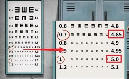 2、右转来到档案柜处,拾取地上的【清洗液】,垃圾桶中获得【脏的酒精瓶】,地上的【工牌残片】,查看视力表,记住圈起来的数字对应的视力数字“4.85”“5.0”,对应五位数密码“48550”。