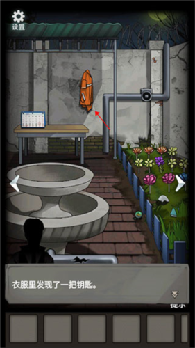 6、然后顺利进入精神病院,但是依旧有门锁进不去,环顾四周,在花坛获得弹珠,到院子墙上的环卫工衣服里找到钥匙。