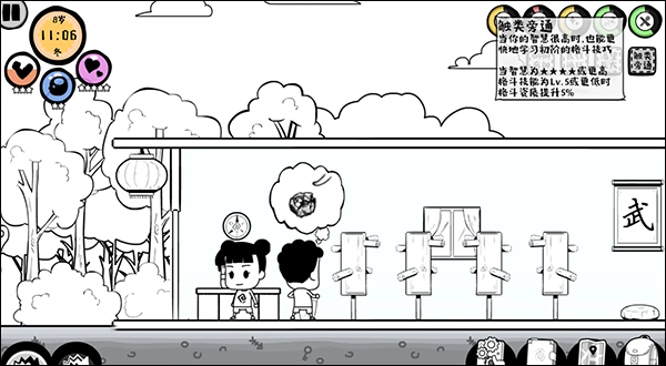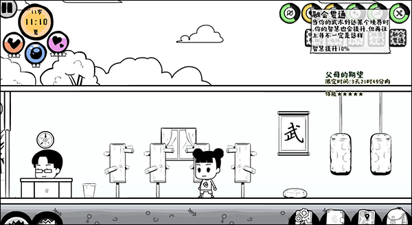 -第四个buff是(良性循环),有钱去武馆,资质不是满星,必定触发。毕竟技能都没学。作用是格斗资质增加5%。