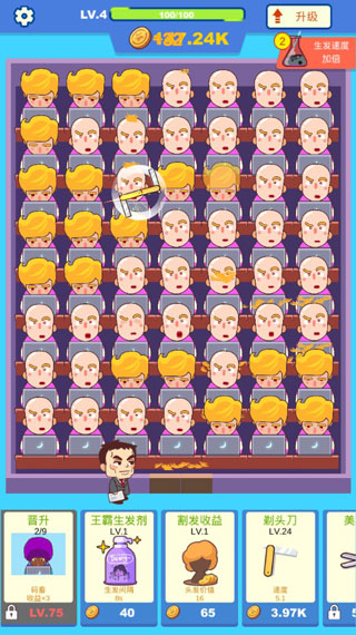 1、游戏偏放置类,我实际玩了半个小时,已经通过了。主升增加剃头收入,平衡一下就崩了,过关速度非常快。