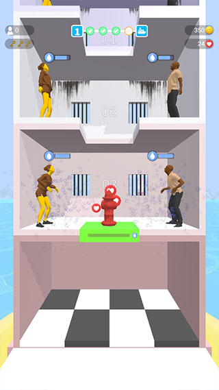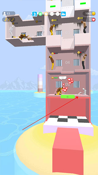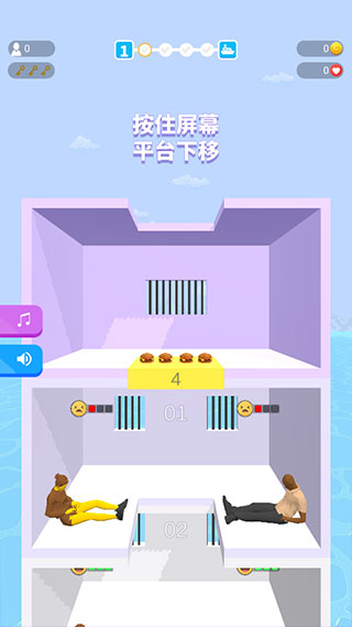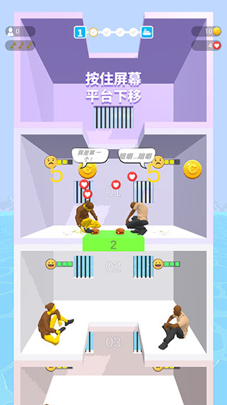2、按住屏幕可以控制黄色的移动平台下降,长按可以加速下降,释放平台就会停住,每个平台都住着一些犯人等待投食,红色表示极度需要,黄色表示一般需要,绿色表示不需要,需要将有限的食物和资源分配给最需要的人,让其得以生存下来。