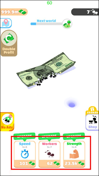 2、这时大家可以看到陆陆续续的有蚂蚁进行搬运,太慢了怎么办?可以点击下方使用金币召唤更厉害的蚂蚁。