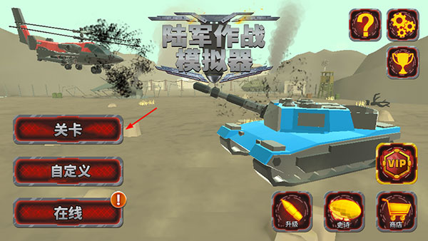 1、在本站下载安装陆军作战模拟器无限钻石版并打开,点击关卡;