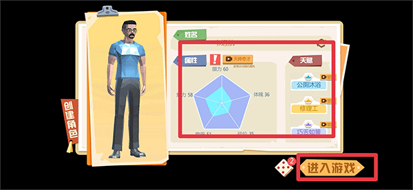 1、打开游戏,首先完成创建角色、姓名、天赋属性后,点击进入游戏
