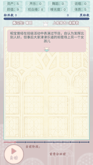 重生顶流练习生官方版是一款超级好玩的文字互动养成游戏,游戏中玩家要扮演怀揣明星梦的练习生,在追梦路上会面临各种关键抉择,每个选择都将影响未来的发展轨迹,玩家还要通过明智的选择来提升各项属性,合理分配天赋点数,喜欢的小伙伴欢迎到本站下载试玩吧!