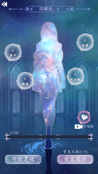 1、进入重生顶流练习生游戏,点击属性强化,先领取免费的闪耀值