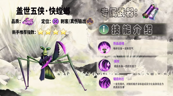 第二步就是要选择自己的初始阵容了。如果只追求开荒,推荐使用盖世五侠基础队,即快螳螂、俏小龙、猴王、悍娇虎。这套阵容的优势在于英雄全免费、易成型。核心输出快螳螂可以说是PVE前期推图神器,其技能不仅爆发伤害高,还为真伤输出,不管是小怪还是BOSS,一套技能就能打半血。