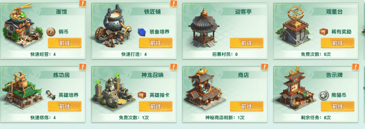 1、铁匠铺:可以生产强化石,强化装备,提高战力。
