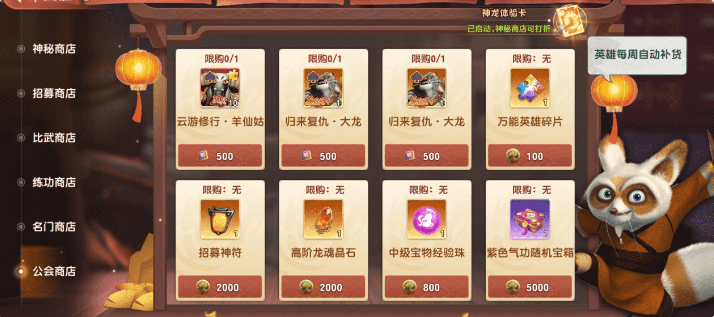 5、神秘商店:可以购买心法,提升英雄等级,提高战力。