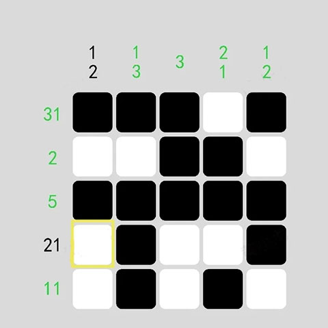 完成数织小游戏,根据数字提示正确填充黑白格,完成后点击下一关按钮。规则:数字表示所在行或列连续黑格的数量。