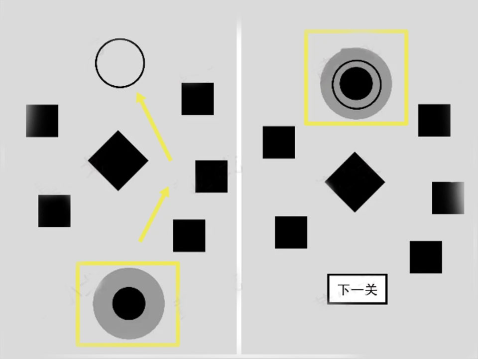 拖动黑圆移动到白圆处,移动过程中不能触碰到周围的方块,到达目标位置后点击下一关按钮。