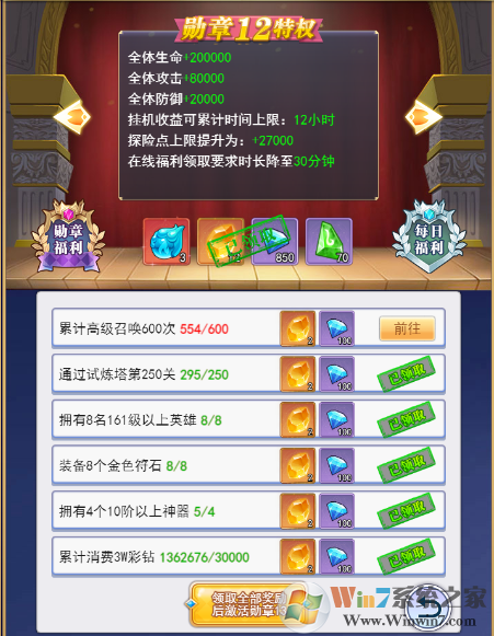 勋章等级是前期提升战力的重要来源之一,但是好多冒险家常常都忽略了。一般来说勋章等级的前五级都是难度不大的,冒险家们只需要按照任务要求一项一项去完成即可提升等级。获得属性提升的同时还可以增加挂机收益累计上限、探险点上限,以及降低在线福利领取要求的时长,可以说是一举多得呢!
