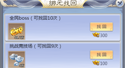 资源找回只有消耗绑元来找回经验和货币,历练找回需要元宝消耗找回奖励,好多道具和资源,值得花点元宝来找回仅仅有限的资源。
