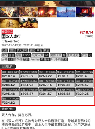 「全球比价」内置各个国家的卡带价格,按低到高排序。