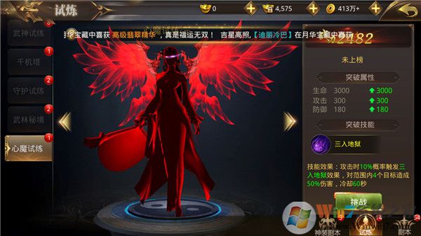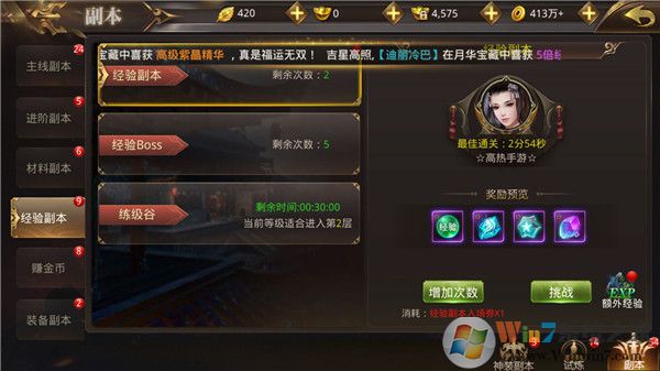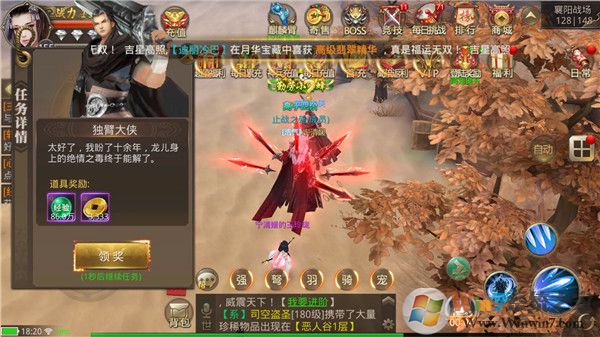 参加各类活动。升到一定等级,还能参加各类PVP战场和活动。目前游戏内开放的活动包括机缘宝矿、瑶池仙泉、心魔幻境、据点争夺、世界BOSS等活动,挑战副本、组队副本、离线竞技、武林争霸等战场。参加这些活动,不仅经验丰厚,还能够赢取英雄令、声望值、荣誉值等奖励,兑换技能书和进阶道具!