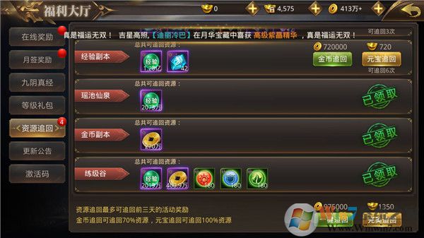 善用资源追回。如果你前一天有活动忘了完全,第二天上线后记得使用游戏中的资源追回功能,可以100%获得前一天损失的活动资源,不仅是经验,各种材料道具也是全数返还,可以说是个非常良心的设定!当然如果你不舍得花费元宝的话,也可以选择用金币追回70%的资源,损失也不算太大。