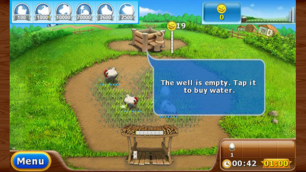 这关就有点难了,金牌几乎是卡着时间只差几秒。面粉是通过仓库右边的飞机来购买的,1个才10块钱,飞机运输也是需要时间的,所以有钱就买了省得后面忘记了。游戏一开始卖掉4只鸡,只留2只,得到的钱就可以买蛋粉加工厂,买熊和蛋饼把蛋粉加工厂升到2级,如果你手够快,2级就足够完成任务了,这关关键是如何喂鸡,只喂一块草地,草地快没了再种,我过关的时候一次井都没用,最后把鸡饿死了,不过蛋正好够,嘿嘿,多试几次。