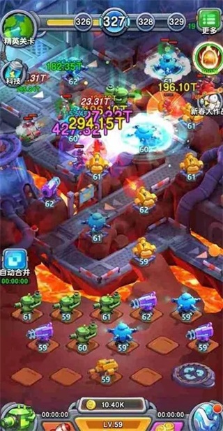 1. 挂机战斗,无限升级。无需大量的手动操作,你只需要简单的合成升级你的炮塔就可以体验爽快刺激的塔防战斗。
