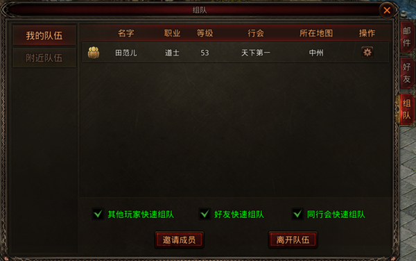 2、在邀请按钮弹出列表中,可以选择附近、好友、行会的成员进行组队,点击成员可以进行查看、发送位置、退出队伍、转移队长等操作。
