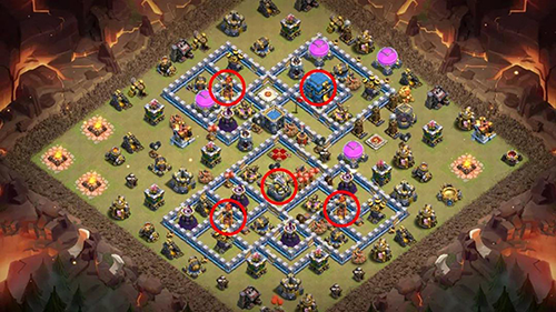 三座多头地狱塔围绕核心区域组成防御区。天鹰火炮和部落城堡中置,对空军流派有不错的防御效果。援兵使用1狗1球5弓箭,能有效拖延敌方女皇的进攻。