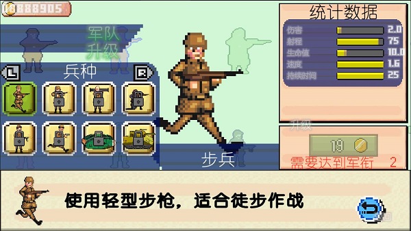 1、一款像素风战争策略游戏,玩家将派遣自己的军队去攻击敌军,有大量的兵种供玩家选择。2、不同的兵种有不一样的作战能力,同时丰富的武器也将这款游戏变得更加精彩。