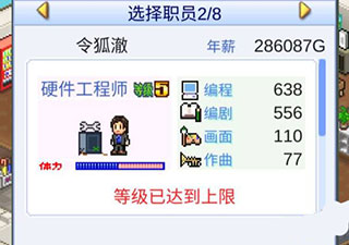 3、因为员工是可以转职的,编程、剧本、美术、音乐这4个是基础职业,可以随时互相转换,“总监”和“制作人”是二级的,也就是前面4个基础职业其中3个达到5级后才会出现这两个。“硬件工程师”是三级的,就是说前面的编程、剧本、美术、音乐、总监”和“制作人”全达到5级才可以出现,“黑客”是最高级职业,其它职业全5级才能转黑客。