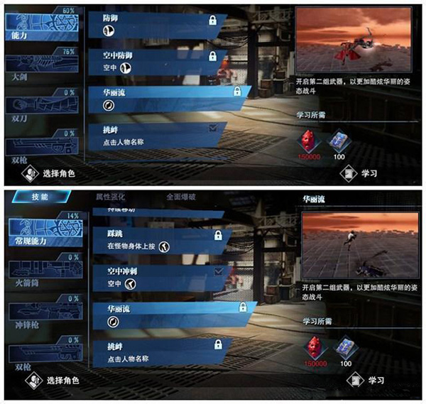 在能力技能中有一个华丽流能力技能,解锁华丽流技能在战斗中可佩带两把主武器(包括华丽流两个角色都是不通用的),切换使用可在战斗中有更多的华丽连招。