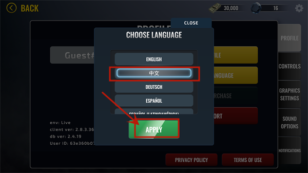 3、在弹出的语言选择框内找到中文,点击“APPLY”即可完成中文设置