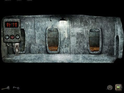 要进入炉房,必须开右侧门,发现左边墙上有个拉手开关,过去拉下,门开了,有个运煤车很快过去了,门又快速的关了!多拉了几次,还是这样!看来只有两个方法,把门卡住,或则跟运煤车一起进入!拉手开关下有个弯钩把手,捡起来,看似像楼梯扶手的这端掉了,安上去!有什么用呢?去拉下楼梯扶手另一端试试,原来这样,远距离控制拉手开关!