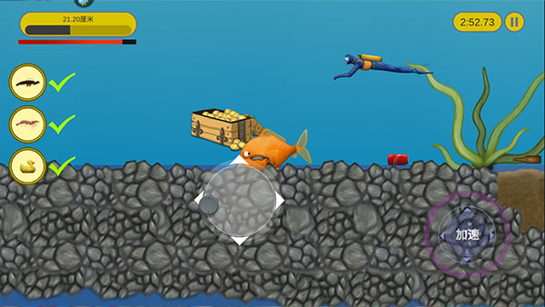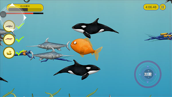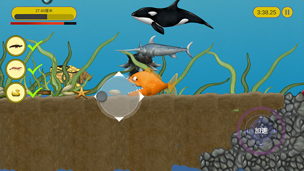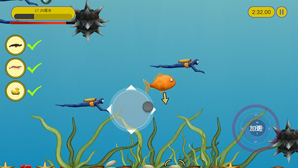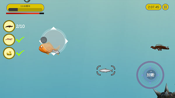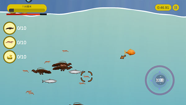 3、玩家通过滑动屏幕控制小鱼的移动,小鱼只能吃比自己小的东西。注意是“东西”,不是“食物”,所以只要是比自身个头小的物体,小到小石块,大到大轮船、战斗机,只要条件允许都能一吞而尽。甚至还能跳上岸去将陆地上的房屋,甚至灯塔装进肚子里,区区人类更是不用说了。不过要注意的是如果比自己体型大的物体有攻击性,就要多加小心了,因为不仅是你家小鱼肚子会饿。例如正在猎食的鲨鱼或大胃王鲸鱼,到了后期因为小鱼变成“水怪”,人类也会派出舰艇或者鱼雷来进行攻击。