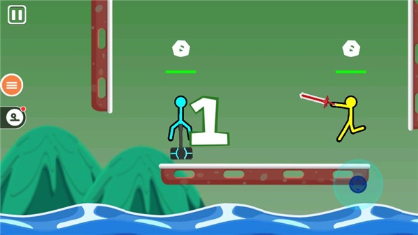 4、击败敌方的方法就是调整方向键(可以长按和短按),将武器打到敌方身上,或者用腿部贴近敌方近身打击(头部伤害更高),直至敌方血条清零,或者将敌方推入海里使其直接出局