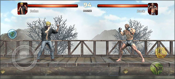 4、进入之后,使用左边的轮盘控制人物的左右移动上跳下蹲动作,左上方是防御按键,使用左边是拳脚攻击,通过游戏金币可以解锁更多的技能招式。
