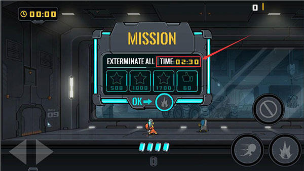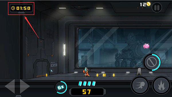 4、左上角显示的是关卡的倒计时,玩家需要在倒计时结束前成功消灭所有敌人。在故事模式中倒计时无法增加,无尽模式中的倒计时可以通过拾取