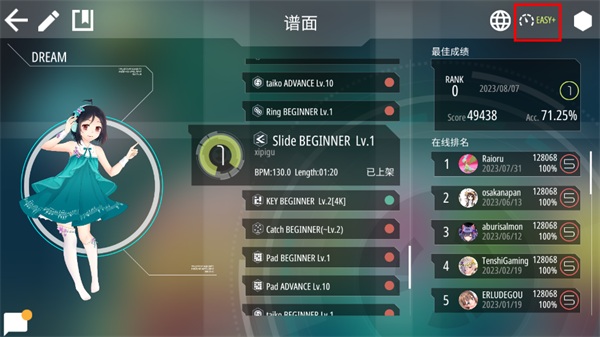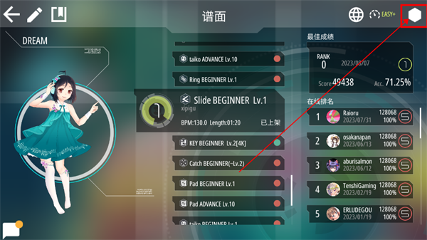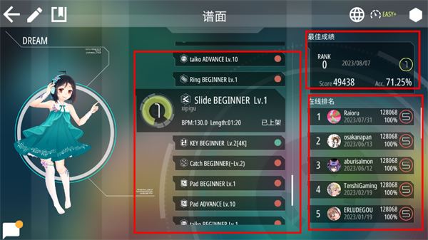 7、下面是打歌界面,中间是谱面的选择,右边是排行榜以及玩家的最佳成绩