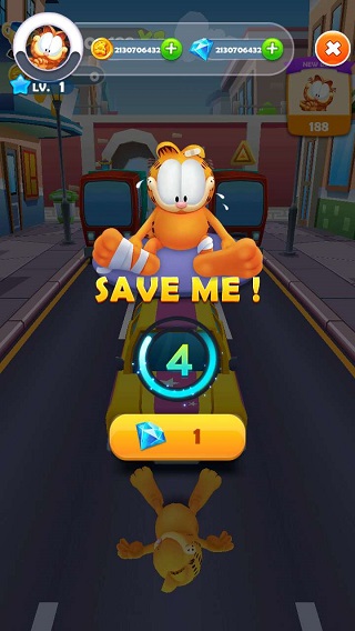 控制加菲猫在广阔的的赛道上左突右闪,闪避危机的同时,获得更多的资源装备