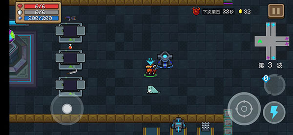 如上图左手边就是我们要守卫的魔法石了,注意当魔法石血量降为零的时候游戏就将结束,因此请守卫好这位爷(反正怪物基本上摸不着它,因为会优先攻击路径上最近的建筑群,因此一定会先拆炮台,不用担心有怪物偷塔) 右手边是每波怪物来之前会刷新的宝箱X3(虽然只能挑一个)一般都是两个武器+一个药瓶,不论拿不拿都会在每波结束时全部刷新,因此拿了不亏(注意武器掉落在地面时,一段时间内不捡取会消失(惨痛教训)因此注意千万随便丢主要使用的武器)