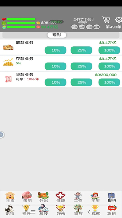 有钱就存,后面家族银行利息提高,注意不要全砸,买宠物,各种服务,吃饭要最好的,基本怎么都死不了;、