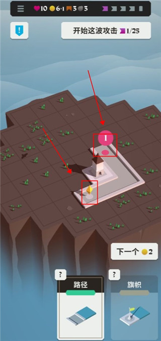 7、当你金币不够后,我们需要点击上面开始这波攻击,将敌人放出来消灭获取金币,以便来放置更多的设备