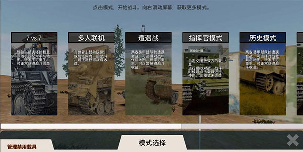遭遇战:俩支装甲部队的遭遇会战。可选择对战年代与地图,玩家可重生,可正常获得战斗收益