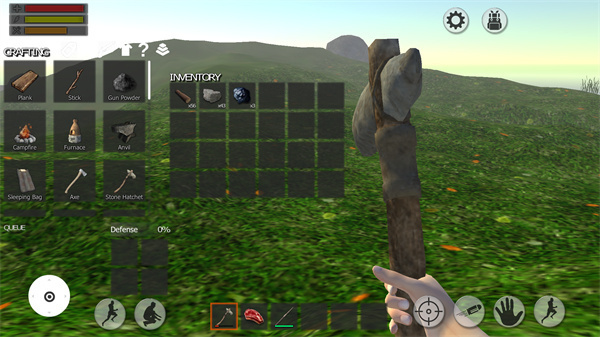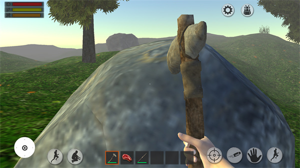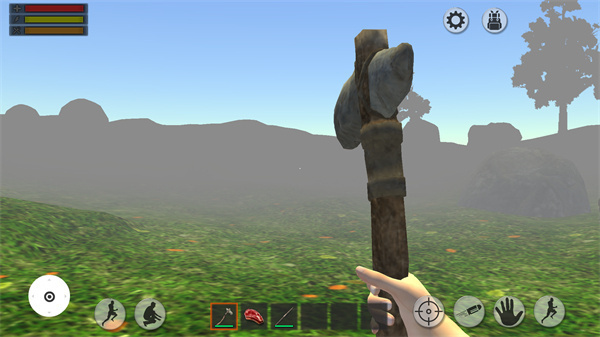 1、下载森林生存最新版游戏之后,首次进入游戏背包内只有石斧、肉以及长矛这些简单的物品。