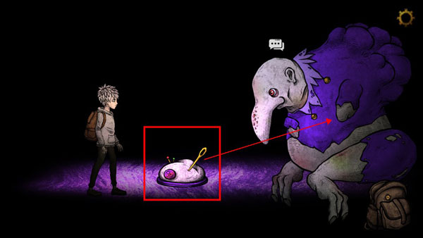 2、醒来后出现在柜子里,一直往右走,出现紫衣女人,对话后将对应符号挪到魔法球上,进入以下情景,红框处拿起金针